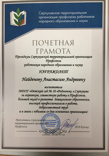 Почётная грамота за активную, совместную работу в Профсоюзе, 2017г.