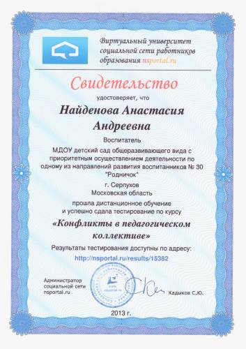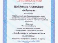 Свидетельство о прохождении дистанционного обучения "Конфликты в педагогическом коллективе"