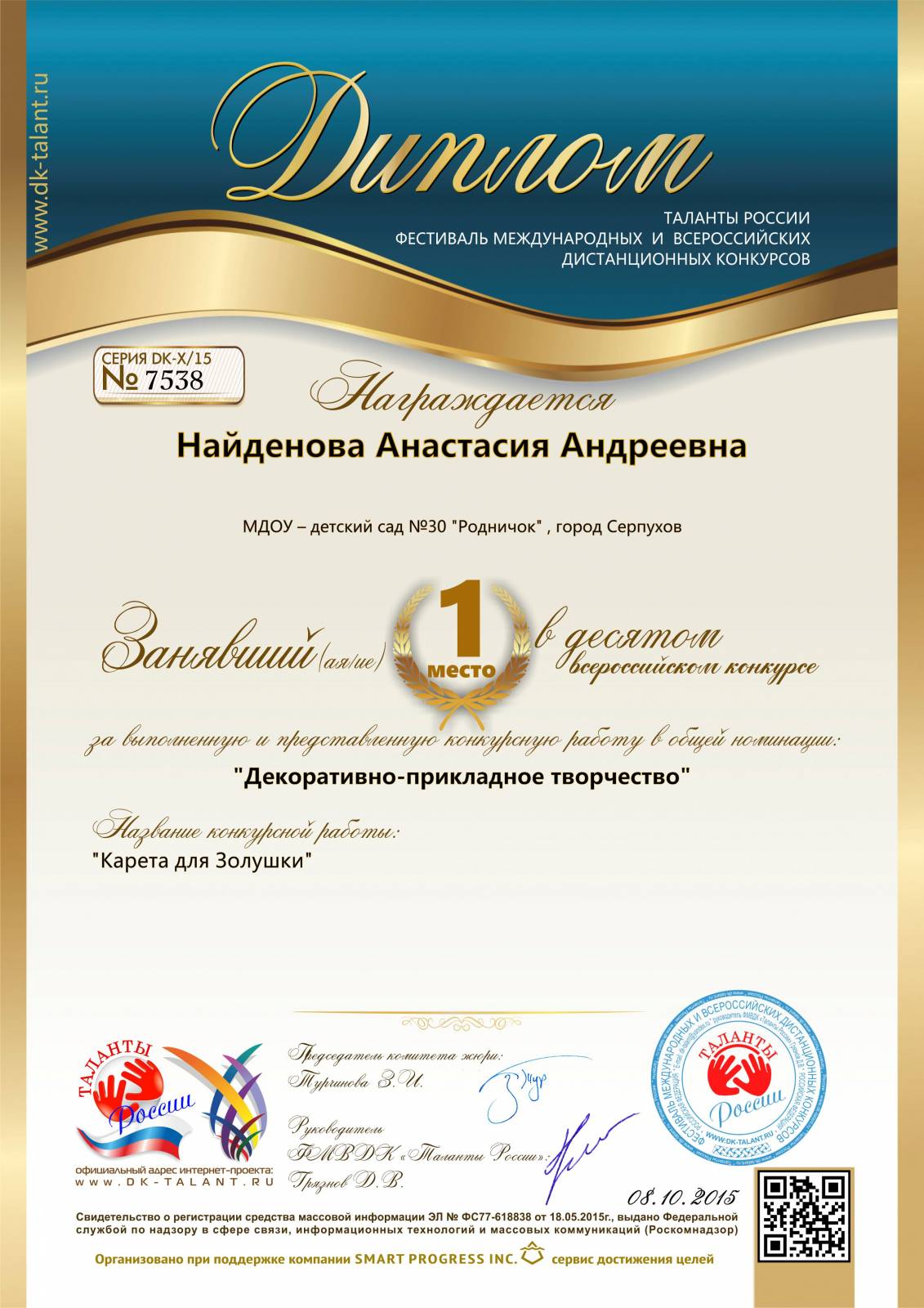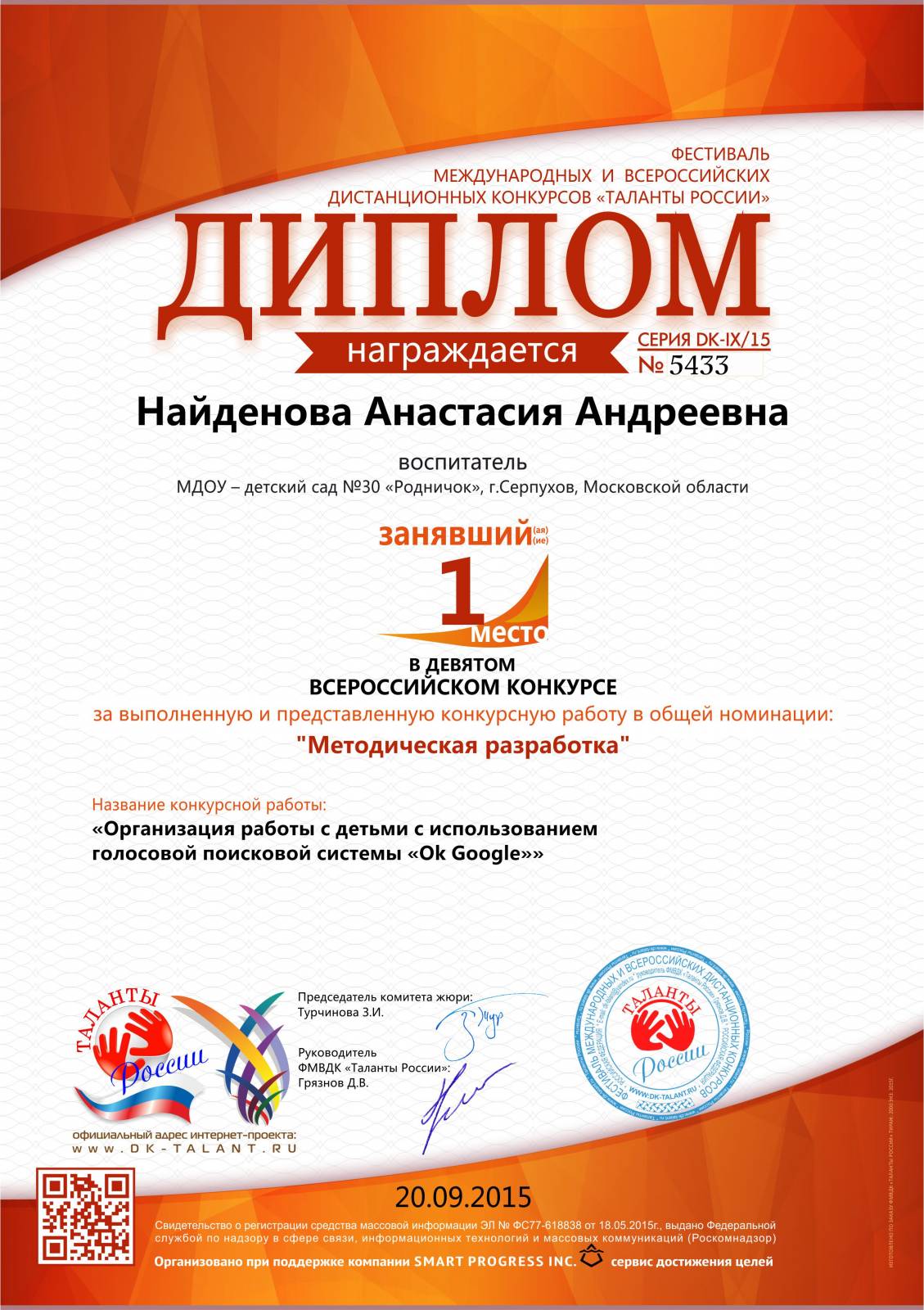 Диплом за победу. Всероссийский центр детского творчества «Мир талантов» в номинации «Волонтёрское движение». Работа ...