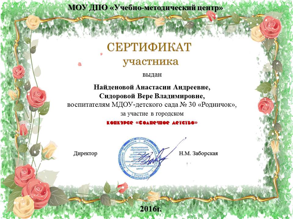 Сертификат об участии в городском конкурсе "Солнечное детство"